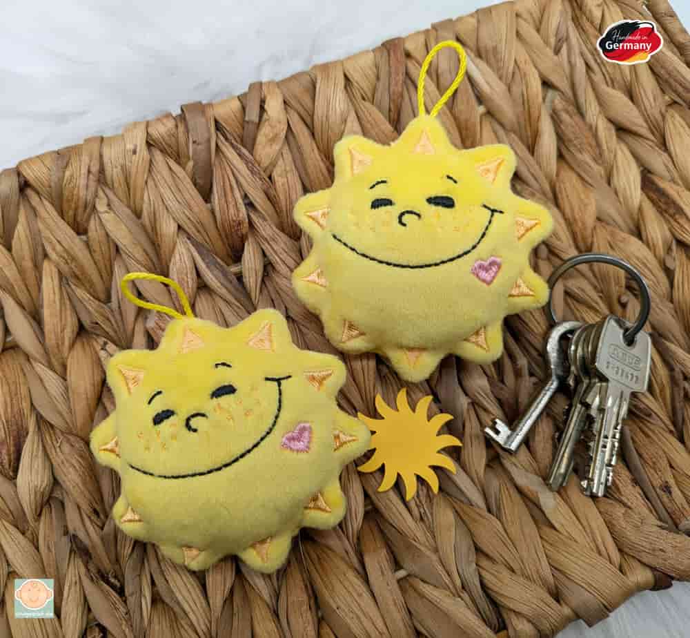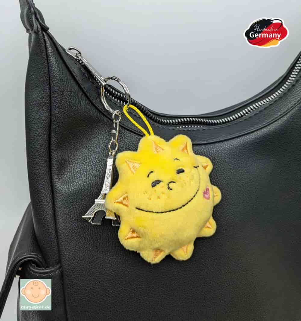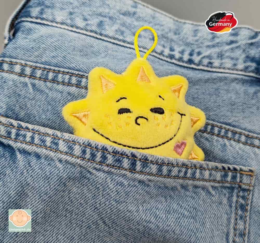 Die Sonne besteht aus weichem gelbem Mikrofaserplüsch und verfügt über eine praktische Aufhängeschlaufe, mit der sie als Taschenbaumler oder Schlüsselanhänger genutzt werden kann. In einem kleinen Täschchen auf der Rückseite lassen sich ein Gutschein, ein Glückstaler oder eine liebe Botschaft verstecken.